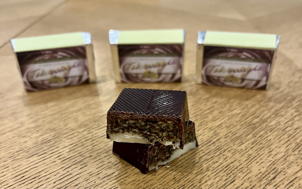 Étcsokoládé burokba töltött darált tökmag, karamellel, fehércsoki talppal. Izgalmas ízvilággal. Összetevők: étcsokoládé (2/3 rész) (70% kakaótartalommal)kakómassza, cukor, zsírszegény kakaópor, természetes vanília, emulgeáló: szójalecitin. Töltelék: tökmag, tejkaramell