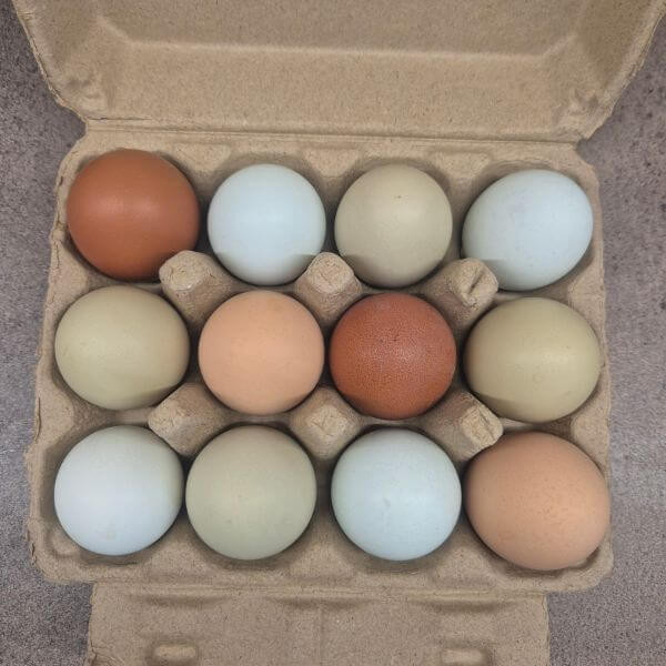 Egy dobozba egy teljes tucat friss tojást pakolunk, közvetlenül a kis erdei tyúkólunkból. A tyúkjaink szabadon kapirgálnak a fák alatt, ezért a tojások nemcsak frissek, hanem igazán ízletesek is. Mivel többféle fajtájú tyúk gondoskodik róluk (Cream Legbar, Shaver Farm, Itáliai, Australorp), a dobozban mindig színes válogatás vár: a világoskéktől egészen a mélyebb barnáig. Természetes, tápanyagdús tojások - pont úgy, ahogy a természet megalkotta.