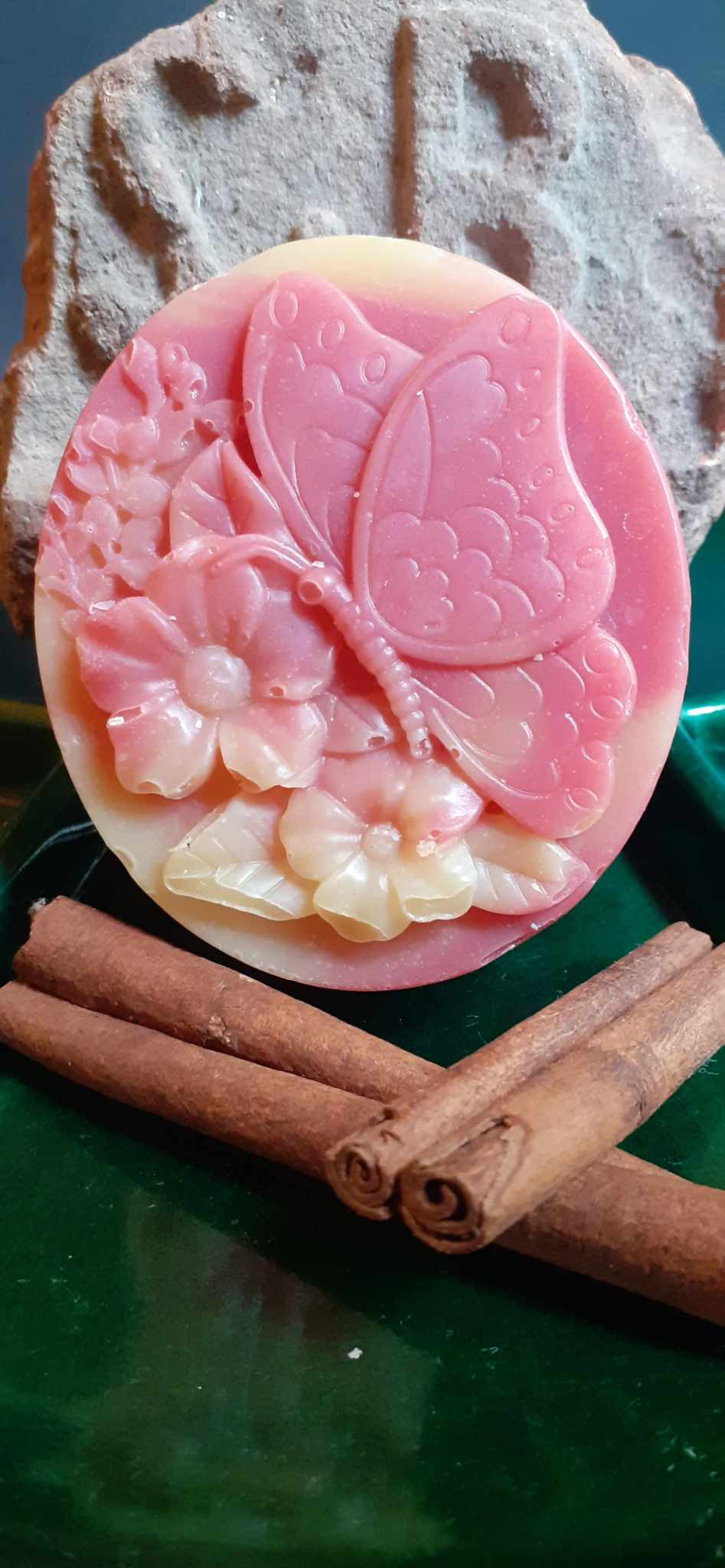 Trilla 12  szappanságom -  fahéj-ylang ylang- pacsuli 100% természetes illóolajokkal és 50% elszappanosított olívaolajjal. Általános bőrtípusra, fürdő-és kézmosószappanként ajánlva.  "A pacsuli illóolaj más illóolajokban ritkán található összetevőket tartalmaz, legfontosabb alkotóeleme a pacsulol és a pogosztol. Emellett pedig azért is különleges, mert az idő múlásával egyre jobban "beérik", nehéz és elbűvölő, tartós illatot árasztva. Minden bőrtípus ápolására alkalmas, a bőrre többszörösen jótékony hatást gyakorol: élénkíti, regenerálja, frissíti és serkenti a vérkeringését. Ezért vízvisszatartás illetve cellulitisz okozta elváltozásokra és visszérproblémákra használják. Antibakteriális és gombaellenes hatású, csökkenti a gyulladásokat, így bőrfertőzések, pattanások, allergiás bőrgyulladás, lábgomba és korpásodás kezelésére is alkalmas. Puhítja a száraz bőrt, csökkenti a ráncosodást, feszesít, erősíti a szöveteket és elősegíti a sebgyógyulást. Mivel szabályozza a faggyúmirigyek működését, kiváló a zsíros bőr és haj ápolására, emellett enyhíti a napégés, pikkelysömör vagy ekcéma kellemetlen tüneteit, mérsékli a hegesedést és dezodoráló hatása is ismeretes." "A fahéj illóolaj fertőtlenítő, baktérium-, gomba- és vírusölő, fájdalomcsillapító, és gyulladásgátló tulajdonságú. Megszünteti a végtagfájdalmakat és izommerevséget, dezodoráló, vérzéscsillapító, összehúzó és bőr tonizáló hatású. Mivel fokozza a bőr vérkeringését, narancsbőr kezelésére is használják. Depresszió esetén párologtatva hangulatjavító hatással bír, valamint afrodiziákumként is ismeretes. Arra érzékenyeknél allergiát okozhat, mivel irritálja a nyálkahártyát, és fahéjaldehid tartalma miatt erősen érzékenyítő. Kisgyermekek, kismamák és magas vérnyomásban szenvedők részére nem javasolt a fahéj illóolaj alkalmazása." "Az ylang-ylang illóolaj antibakteriális, görcsoldó és gyulladáscsökkentő hatású, magas vérnyomás és menstruációs zavarok kezelésére is alkalmazzák, párologtatva csillapítja a köhögést és a fejfájást. Kozmetikai készítményekben gyakran használják faggyúmirigy működést szabályozó, bőrregeneráló, bőrtonizáló hatása miatt. Minden bőrtípus ápolására alkalmas, még a száraz, érzékeny, gyulladt, gyorsan öregedő, ráncos bőrre is, de kezelhetők vele a pattanások, a szeborrea, és rovarcsípés esetén is segítséget jelenthet." Összetevők: kókuszolaj, olívaolaj, állati zsiradék, 100% természetes ylang ylang-fahéj-pacsuli illóolajok, mica (ásványi színező) keményítő, nátrium hidroxid, desztillált víz, nátrium laktát, glicerin* *a szappanosodás során természetes úton keletkezik